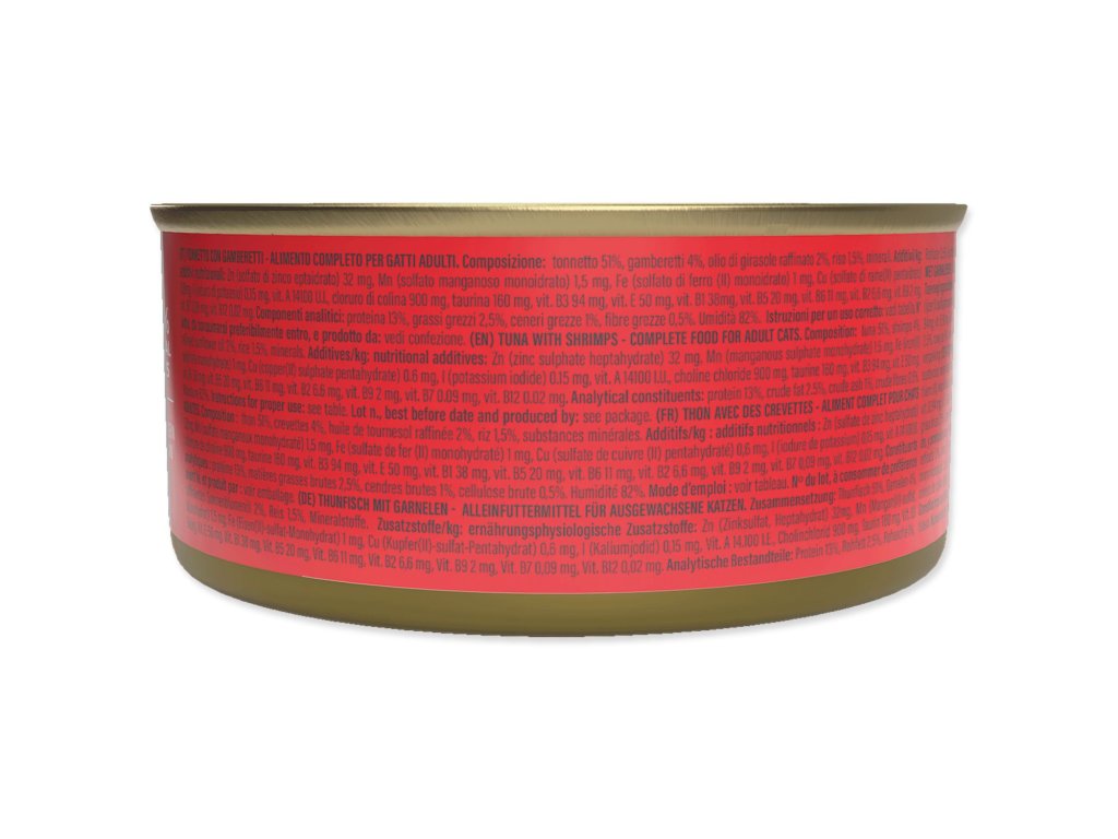 Složení: | Tuňák 51 %, krevety 4 %, rafinovaný slunečnicový olej 2 %, rýže 1,5 %, minerální látky. |