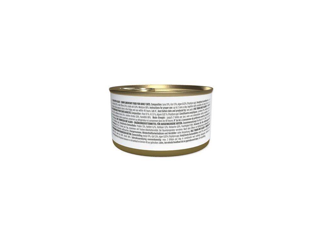 Složení: | Tuňák (51 %), rýže (1,5 %), řasy [Porphyra spp] (0,02 %). |