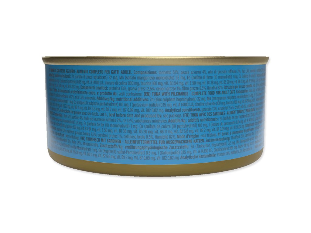 Složení: | Tuňák 51 % sardinky 4 %, rafinovaný slunečnicový olej 2 %, rýže 1,5 %, minerální látky. |