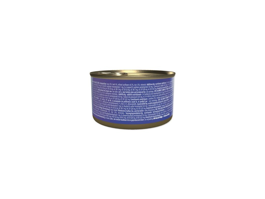 Složení | Tuňák 51 %, hovězí filetky 4 %, rýže 1,5 %, rafinovaný slunečnicový olej 2 %, minerály. |