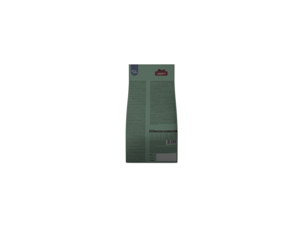 Složení: Obilniny, maso a výrobky živočišného původu (z toho sušené hovězí 20 %), vedlejší výrobky rostlinného původu (z toho sušená čekanka 0,2 %), ryby a vedlejší výrobky z ryb, zelenina (z toho hrášek 4 %), oleje a tuky, semínka, minerální látky.