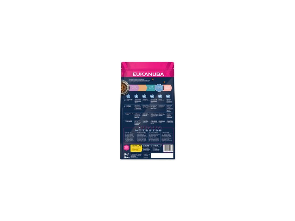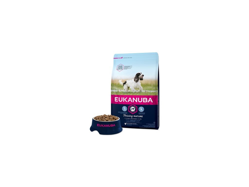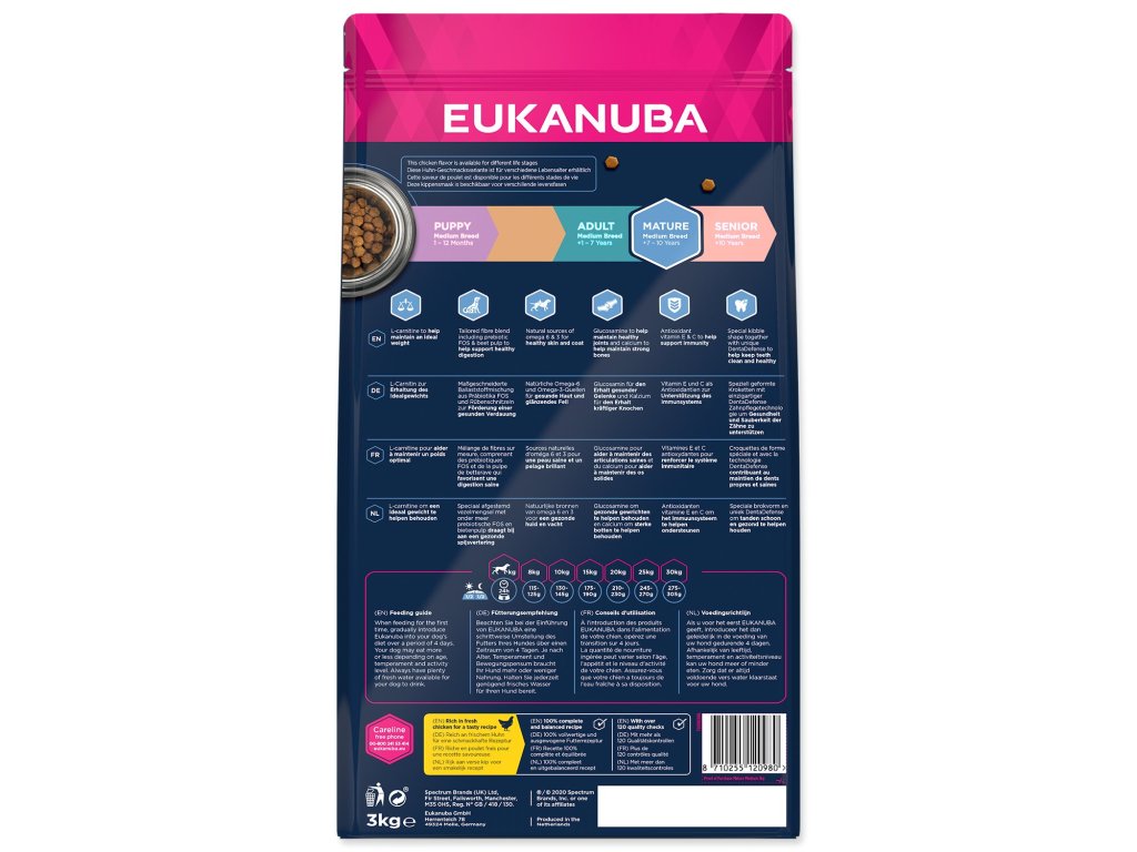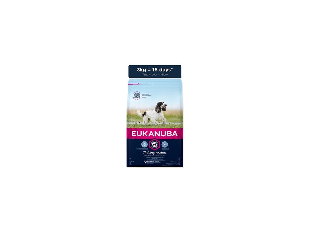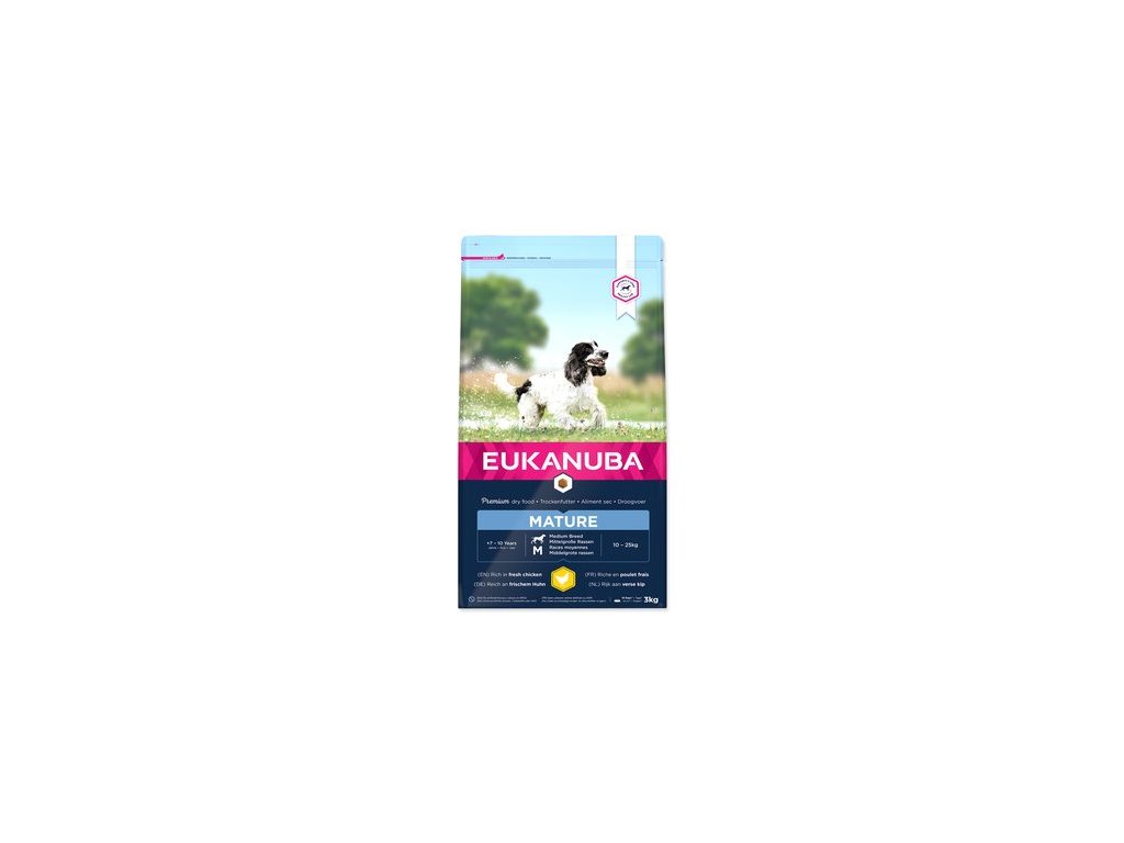 Nová EUKANUBA vylepšená receptura se zaměřením na konkrétní fázi života - pro starší psy středně velkých plemen od 7 do 10 let – poskytuje na míru upravenou výživu pro zdravé stárnutí vašeho staršího psa. Naše jedinečná na míru upravená receptura pro středně velké starší psy obsahuje směs vlákniny, prebiotika FOS a řepné dužiny pro podporu zdravého zažívání, vápník pro zdravé kosti, glukosamin pro zdravé klouby, přirozený zdroj mastných kyselin omega-6 a omega-3 pro zdravou kůži a srst, L-karnitin, který pomáhá s udržením ideální váhy a antioxidanty, vitamin E a C pro podporu imunitního systému. Naše unikátní granule ve tvaru šestiúhelníku s přídavkem DentaDefense také pomáhají s udržováním čistých a zdravých zubů. Pokročilá výživa pro středně velké starší psy se zaměřením na podporu optimálního tělesného stavu a celoživotní pohodu.