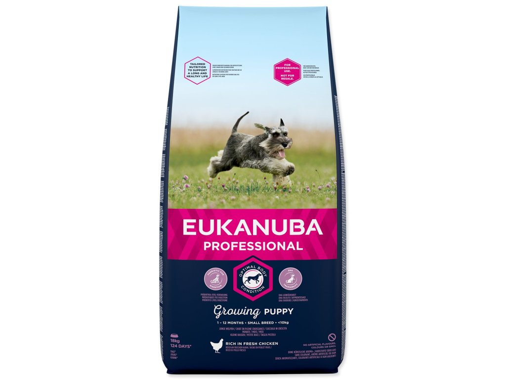 Štěňata malých plemen spalují více kalorií a potřebují více energie na kilogram tělesné hmotnosti než štěňata větších plemen. Tato strava Eukanuba dodává optimální množství proteinů, tuku a karbohydrátů na pokrytí těchto nároků. Poskytuje všechny důležité vitamíny a minerály nezbytné pro optimální růst. Obsahuje přísady vysoké kvality a velké množství živočišných proteinů, z nichž kuřecí maso představuje hlavní zdroj.