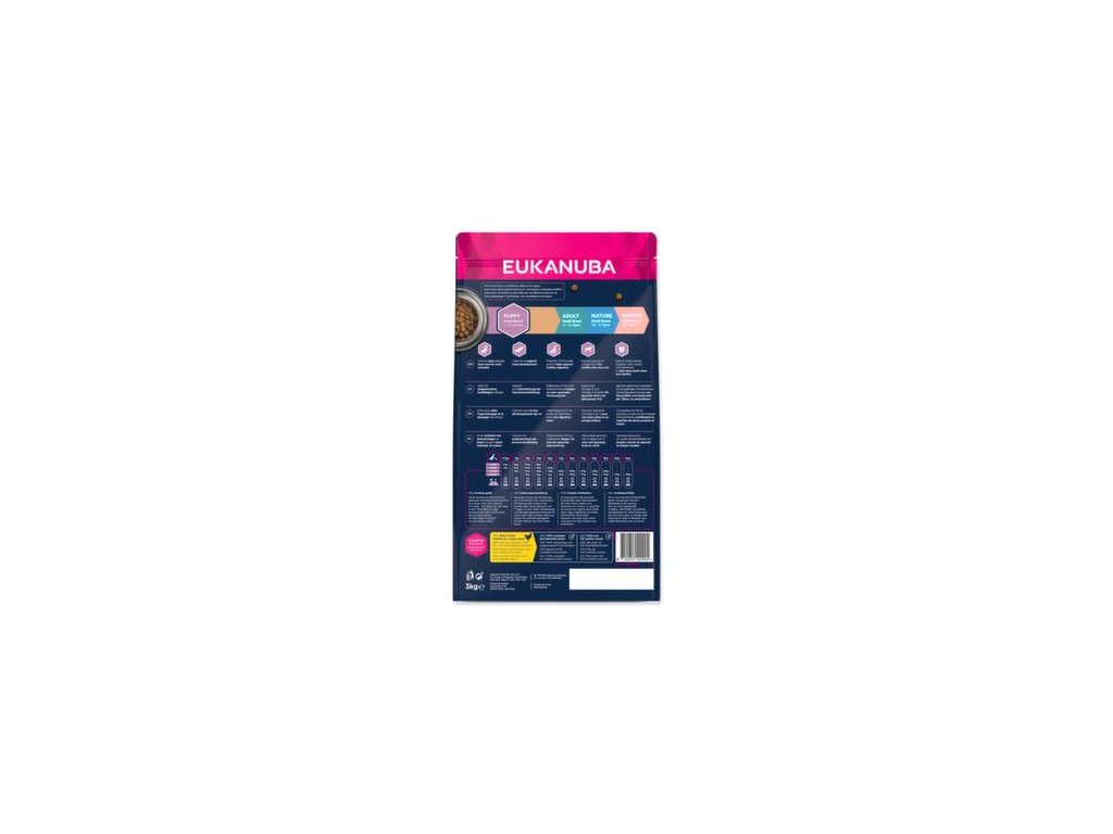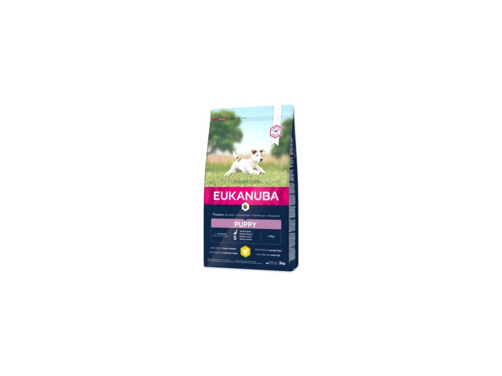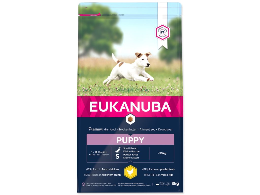 Nová EUKANUBA vylepšená receptura se zaměřením na konkrétní fázi života - pro štěňata malých plemen psů od 1 do 12 měsíců – poskytuje na míru upravenou výživu pro podporu růstu a rozvoje vašeho štěněte. Naše jedinečná na míru upravená receptura pro štěňata malých plemen psů obsahuje DHA, díky které se štěňata rychleji učí a snáze se cvičí, směs vlákniny, prebiotika FOS a řepné dužiny pro podporu zdravého zažívání, vápník pro zdravý růst kostí a přirozený zdroj mastných kyselin omega-6 a omega-3 pro zdravou kůži a srst. Naše unikátní granule ve tvaru šestiúhelníku s přídavkem DentaDefense také pomáhají s udržováním čistých a zdravých zubů. Pokročilá výživa pro štěňata malých plemen psů se zaměřením na podporu optimálního tělesného stavu a celoživotní pohodu.
