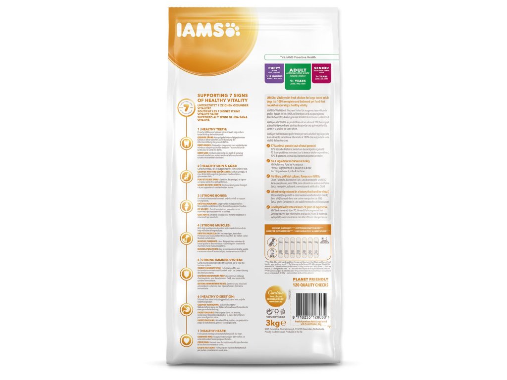 Krmivo IAMS for Vitality pro dospělé psy velkých plemen je 100% kompletní a vyvážené, odborníky sestavené krmivo, které bude vašemu zvířeti chutnat a svědčit. Naše nová a vylepšená receptura pro dospělé psy s čerstvým kuřecím masem je založena na kvalitních živočišných bílkovinách, které byly pečlivě vybrány, aby podporovaly sedm znaků zdravé vitality psa. Aby byl váš pes zdravý, aktivní a plný energie, obsahují naše lahodné receptury až 77 % živočišných bílkovin (z celkového obsahu bílkovin).